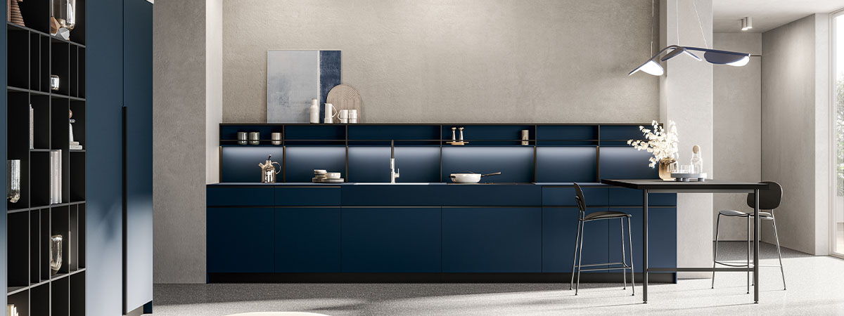 Il blu navy è una tonalità più decisa e profonda che comunica eleganza, stabilità e carattere. È il colore ideale per chi desidera una cucina che si faccia notare senza risultare eccessiva. Il blu navy, infatti, ha la forza del colore scuro ma la raffinatezza di un tono classico. In cucina si presta a essere usato su mobili o isole centrali, soprattutto se bilanciato da pareti chiare o superfici luminose.