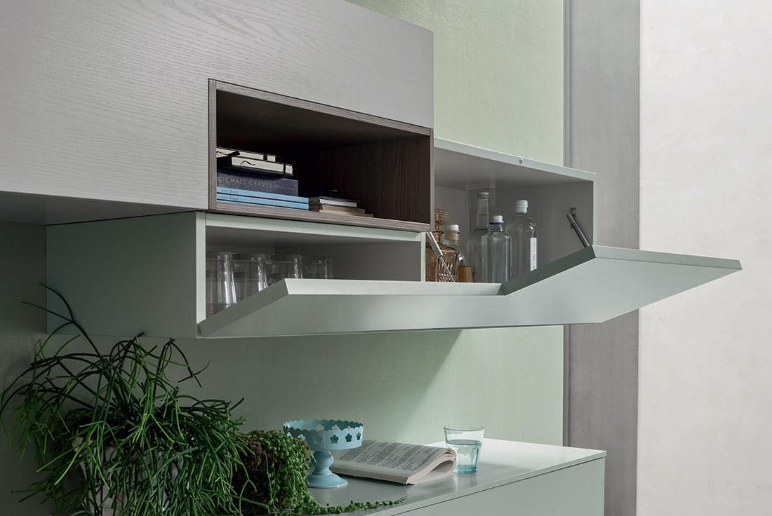 In foto la composizione presentata in finiture Laccato Grigio Pietra_Thè Verde Opaco_Olmo Grigio
