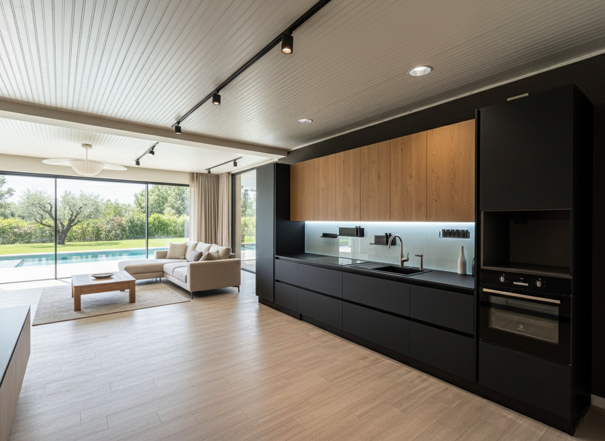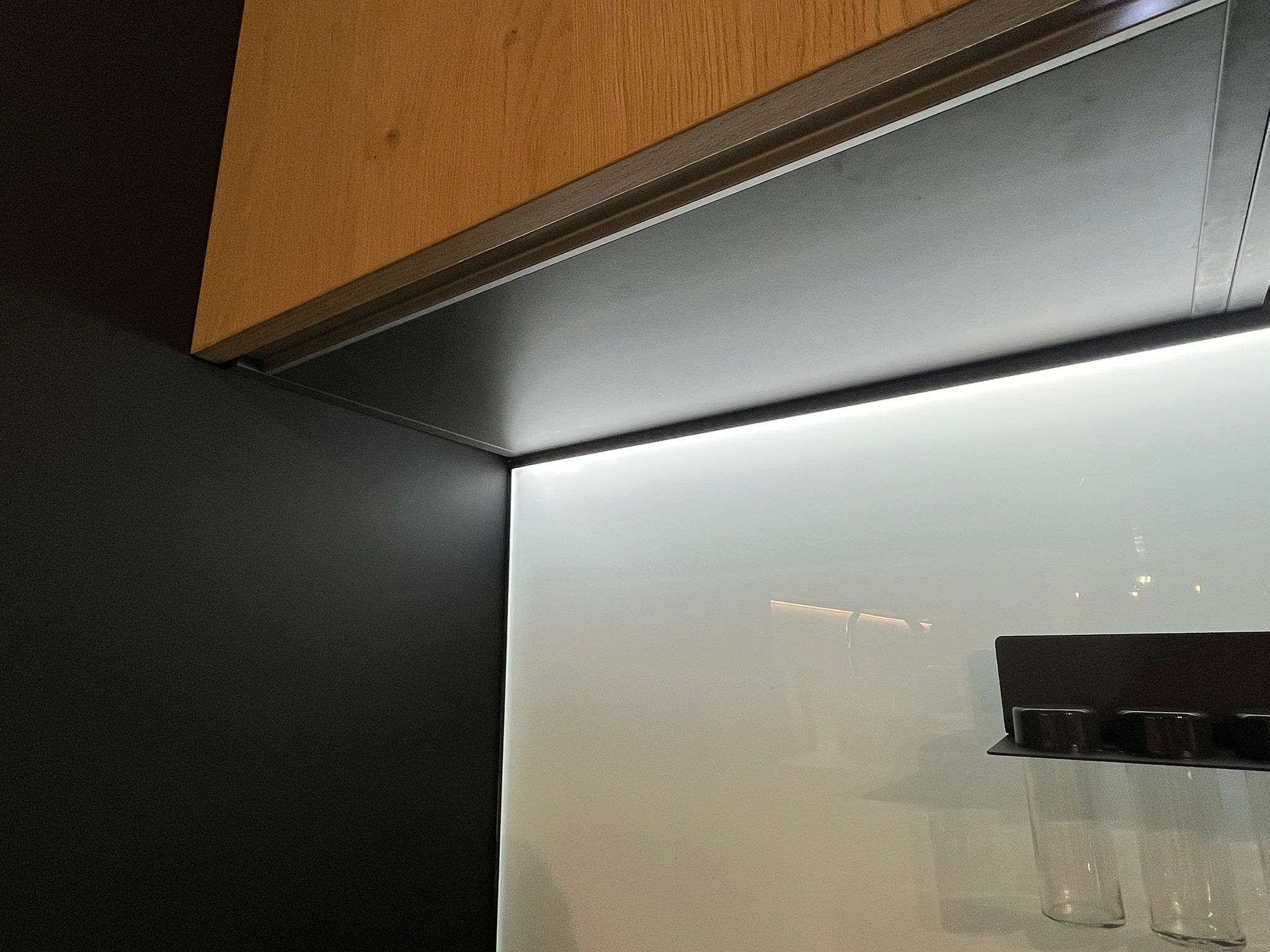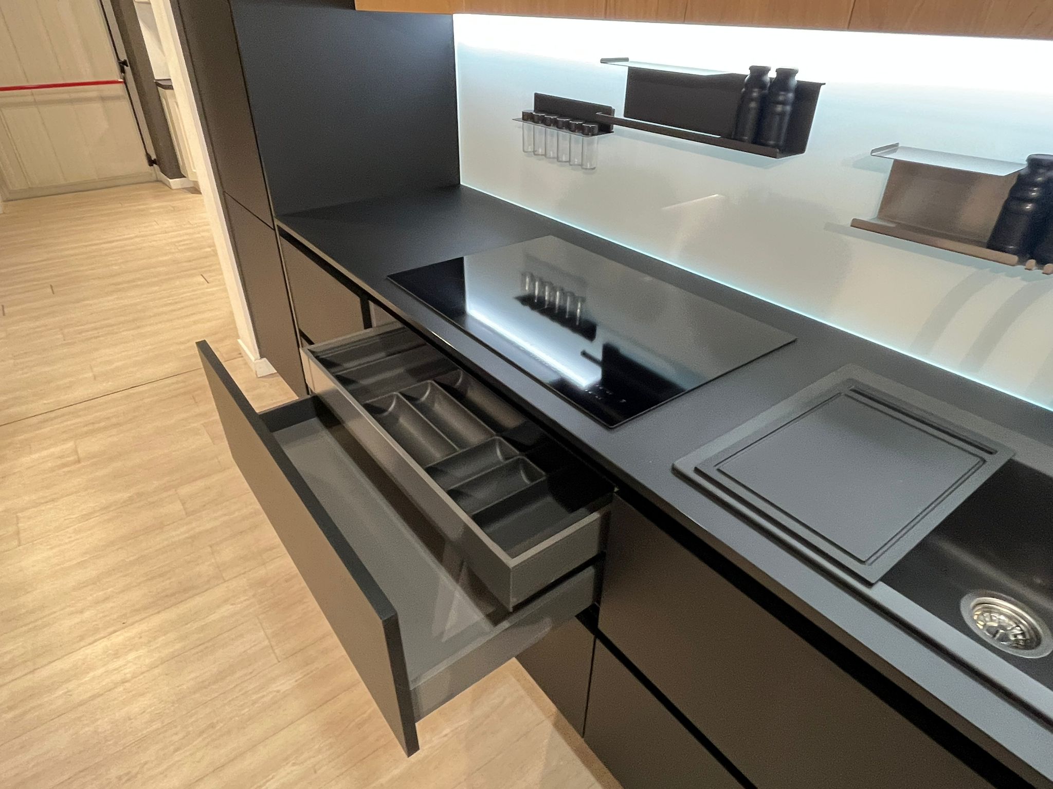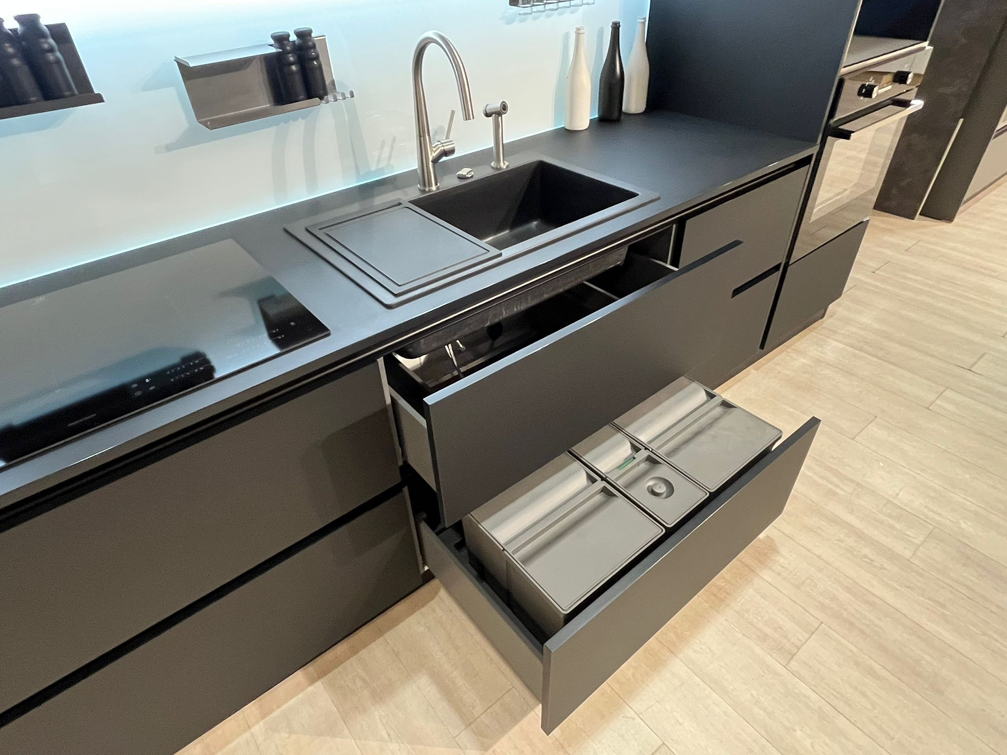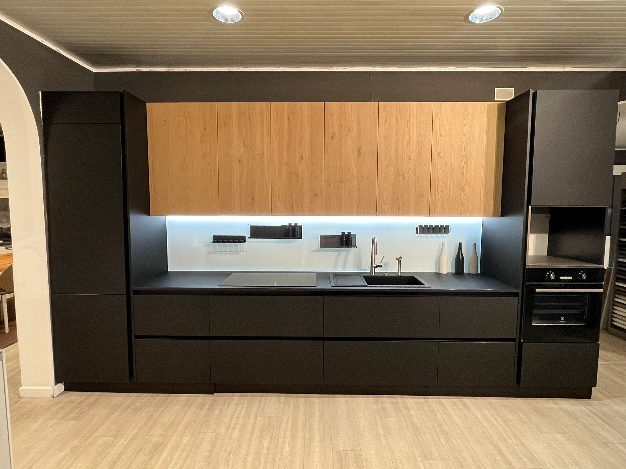 Cucina Expo in Fenix nero opaco e rovere impiallacciato con top in Fenix nero.