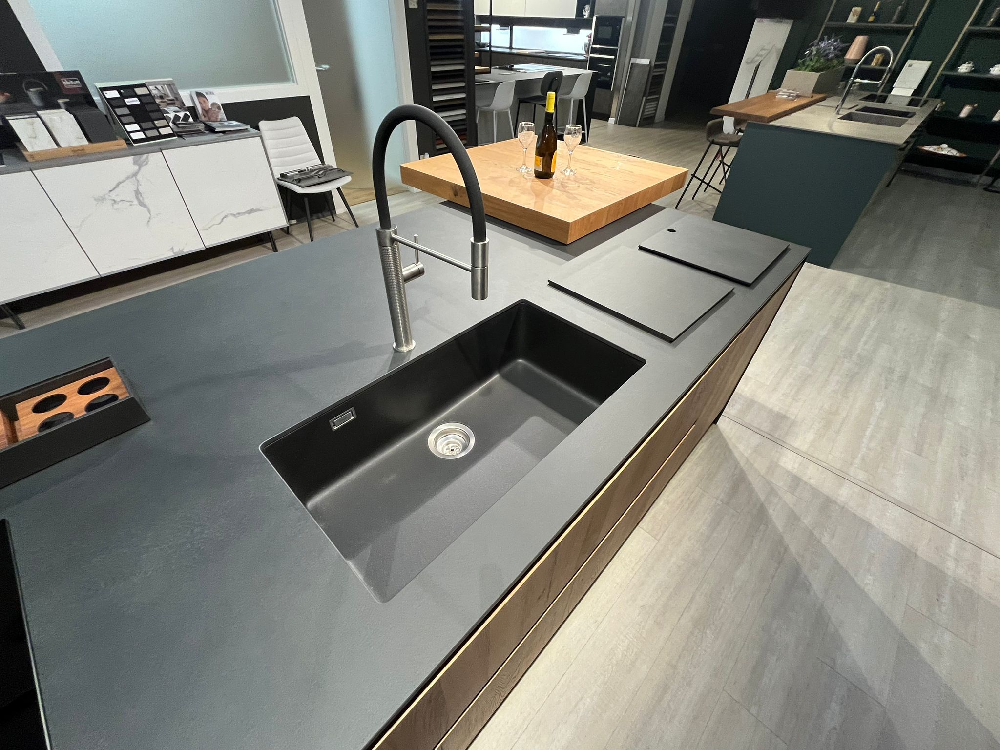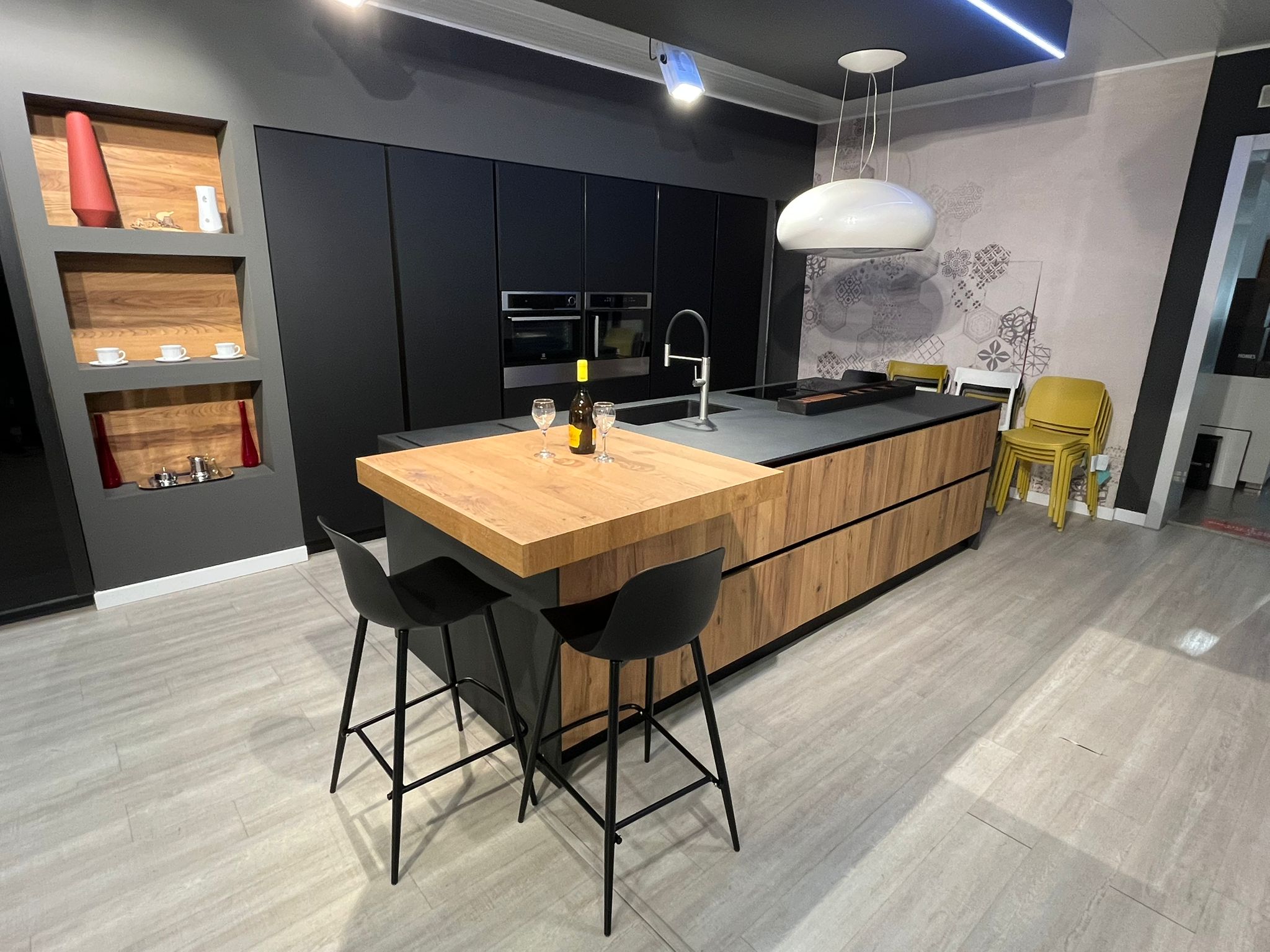 Cucina Expo in rovere travi impiallacciato con top in gres porcellanato nero con colonne in vetro nero opaco.