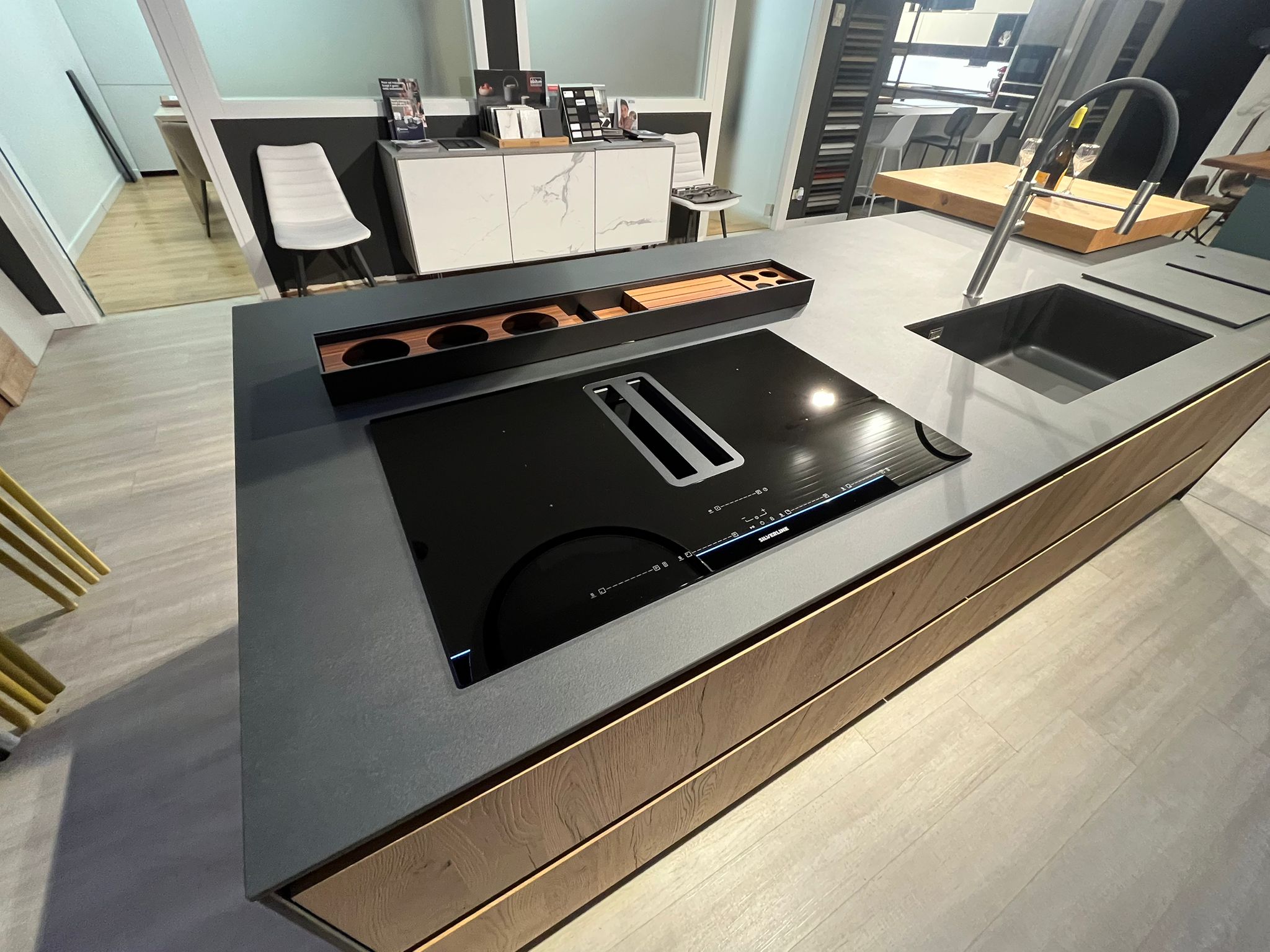 Isola con dimensioni 124x 302cm con piano cottura aspirante integrato e lavello sottotop.