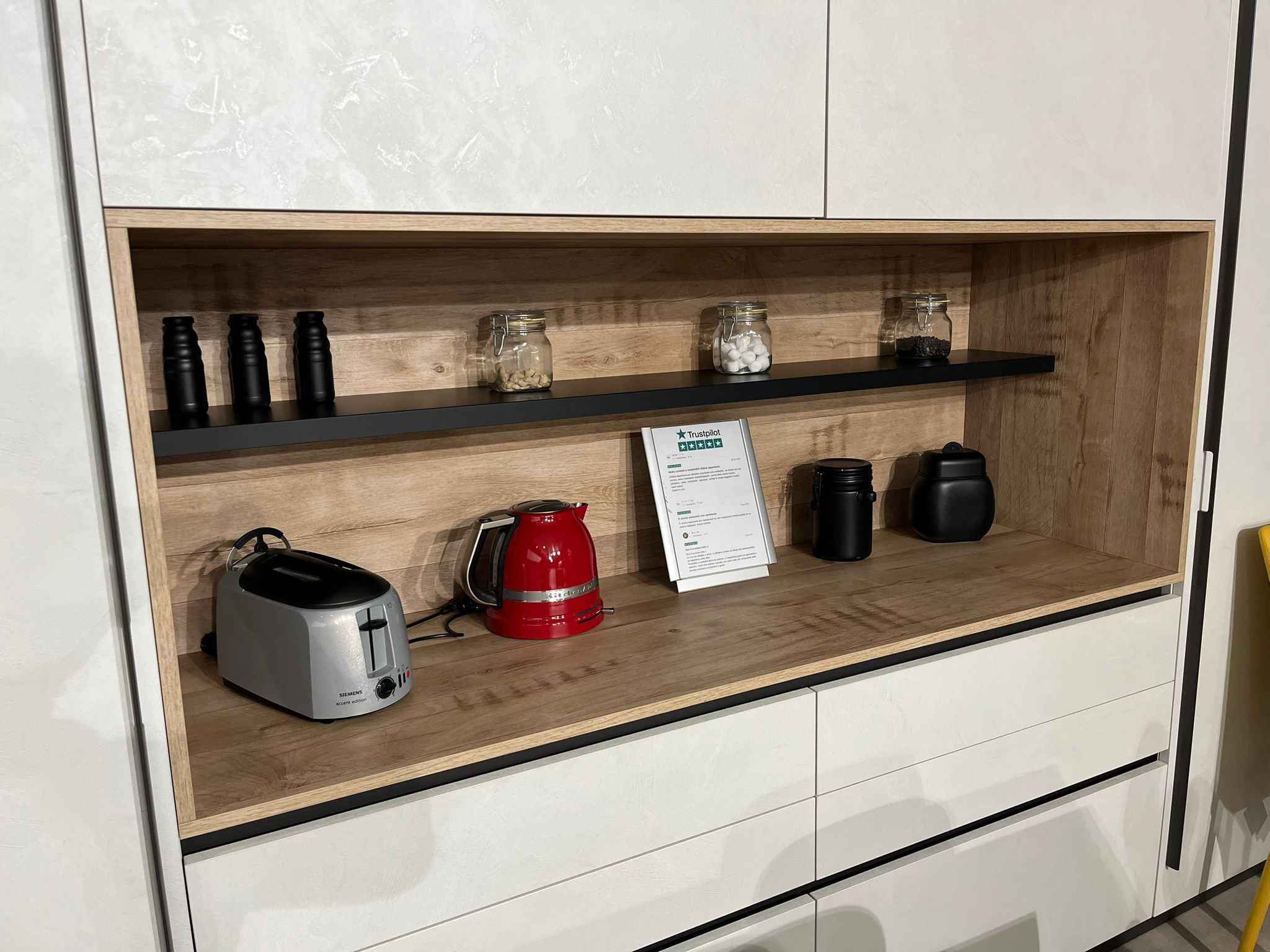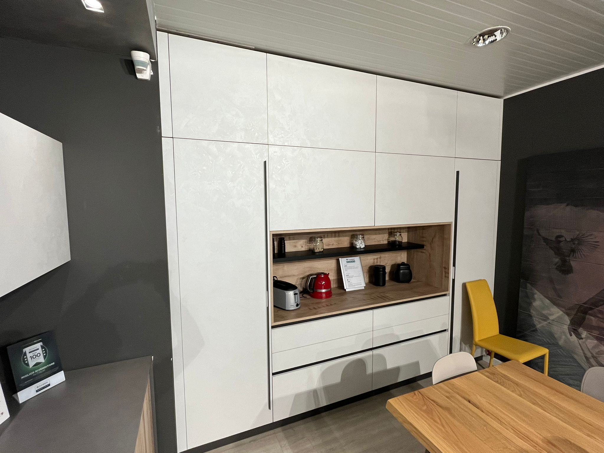 Non è predisposto lo spazio per un frigo, da gestire a libera installazione in un altro punto della stanza o in sostituzione di una delle colonne nella parete fino al soffitto.
