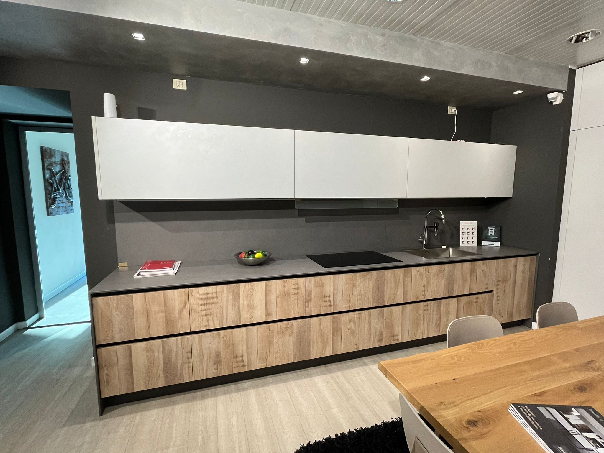 Cucina Moderna Lineare in laminato effetto calce con pensili in laminato effetto legno lunga 323cm con top in gres porcellanato profondo 70cm,