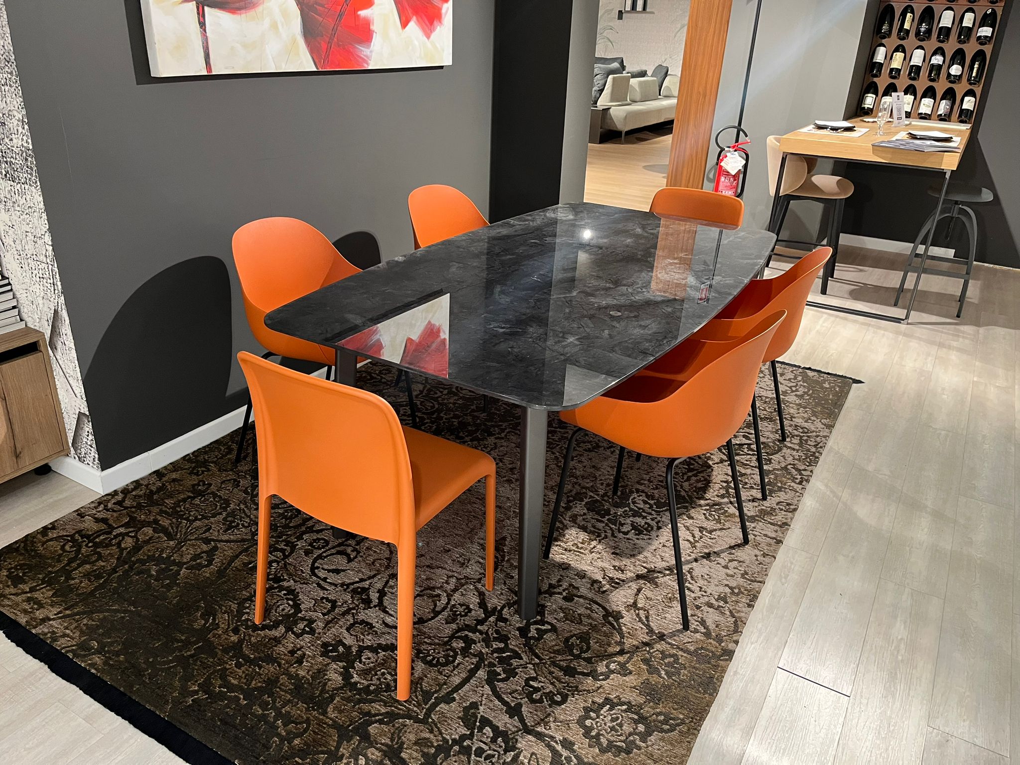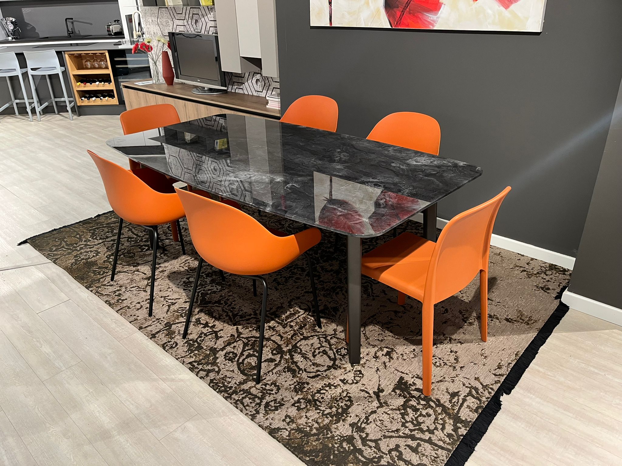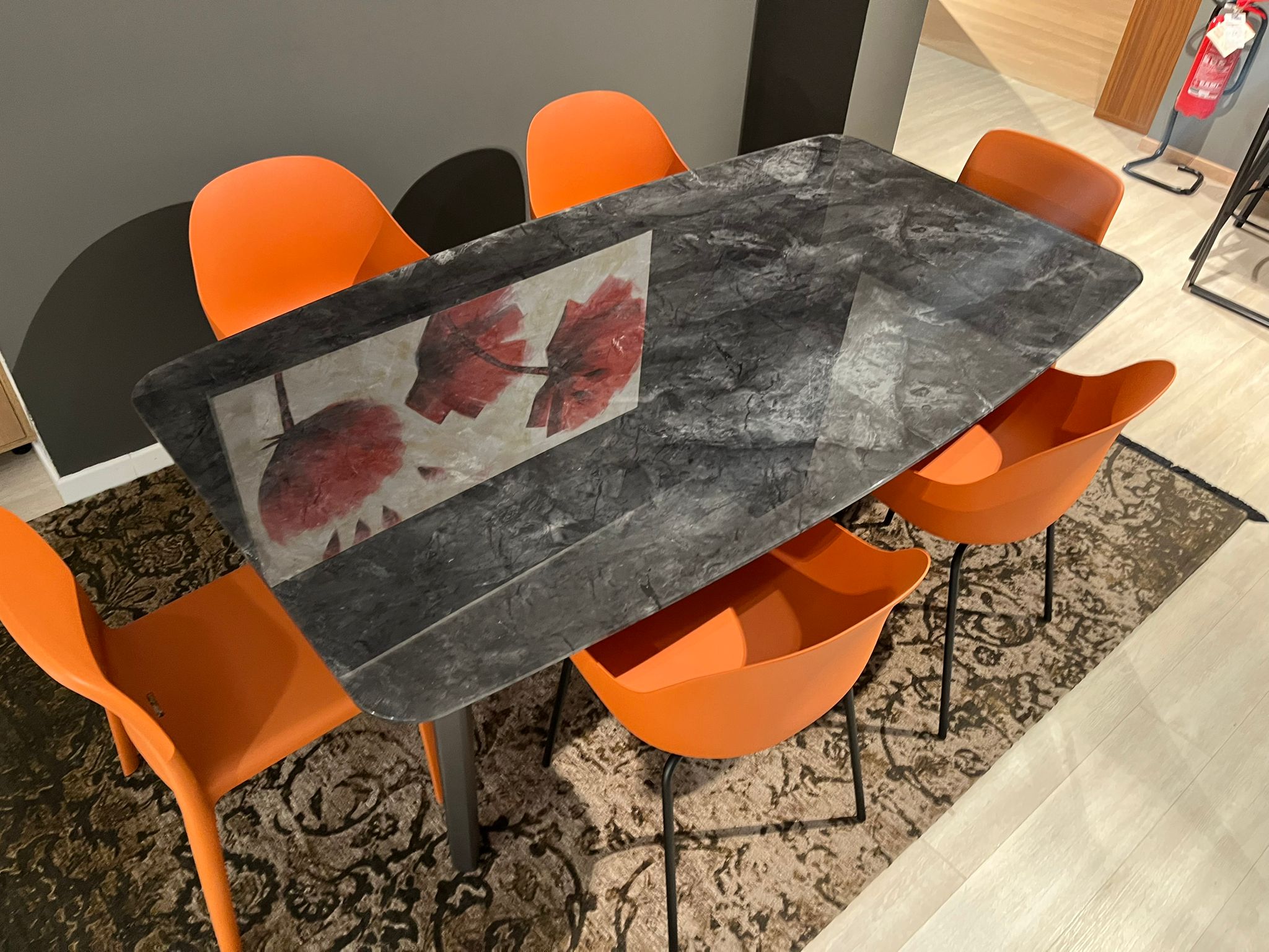 Tavolo a botte in vetro con serigrafia effetto marmo grigio con gambe in metallo grigio antracite,